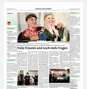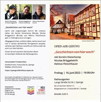 "Geschichten von hier wech"![]() Nicolas Bröggelwirth und Kerstin Honerkamp lesen am Freitag dem 16.Juni 2023 um 19°° Uhr im Rathausgarten in Spenge. Mehr lesen ... |
